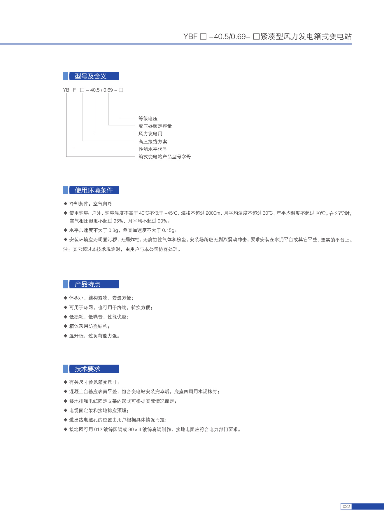 YBF 0 -40.5/0.69-口紧凑型风力发电箱式变电站(以下简称紧凑箱变)是一种将风电机组发出的0.6~0.69kV电压升高到35kV后,并网输出的专用设备。