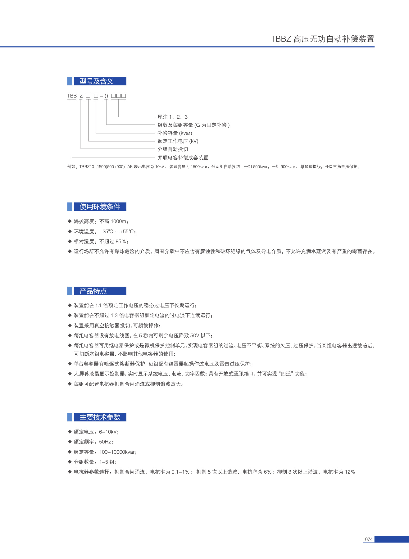 TBBZ系列高压无功自动补偿装置根据6kV、10kV供电母线的电网及负荷状况,通过控制系统电容器组自动跟踪投切,进行无功功率自动跟踪补偿,功率因数达到0.9以上。极大的优化电能质量、节损降耗,提高输配电系统的输送容量。
