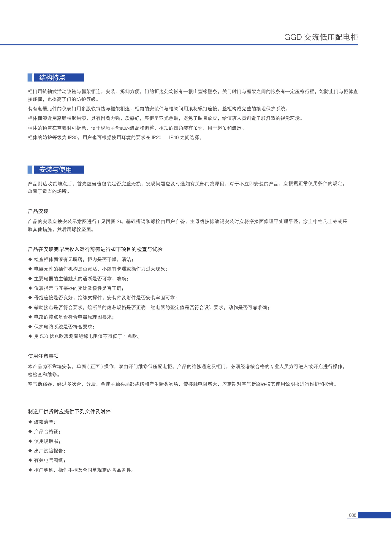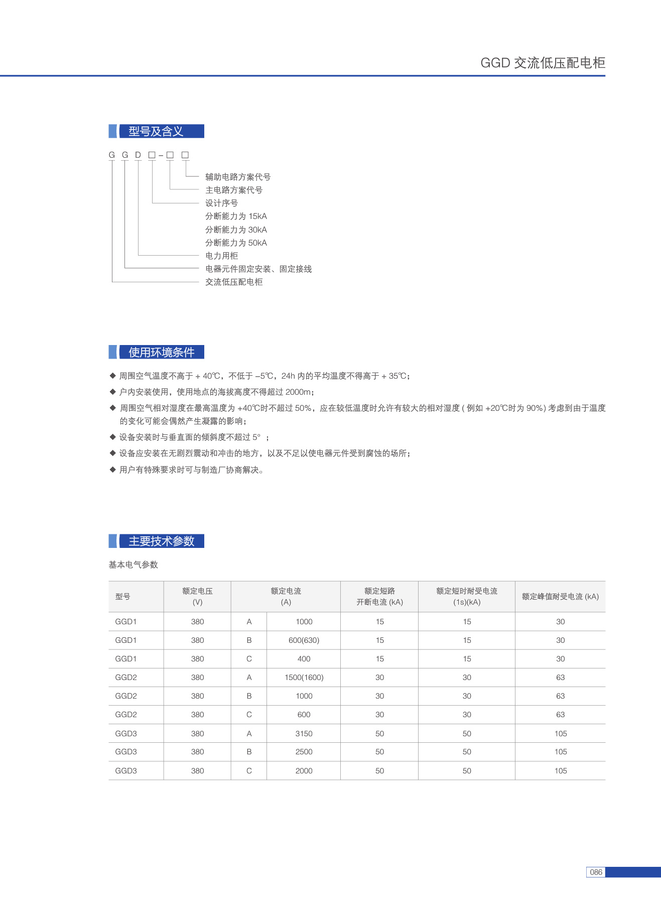 GGD型交流低压配电柜适用于发电厂变电站、厂矿企业等电力用户的交流50Hz,额定工作电压380V,额定工作电流至3150A的配电系统,作为动力、照明及配电设备的电能转换、分配与控制之用。