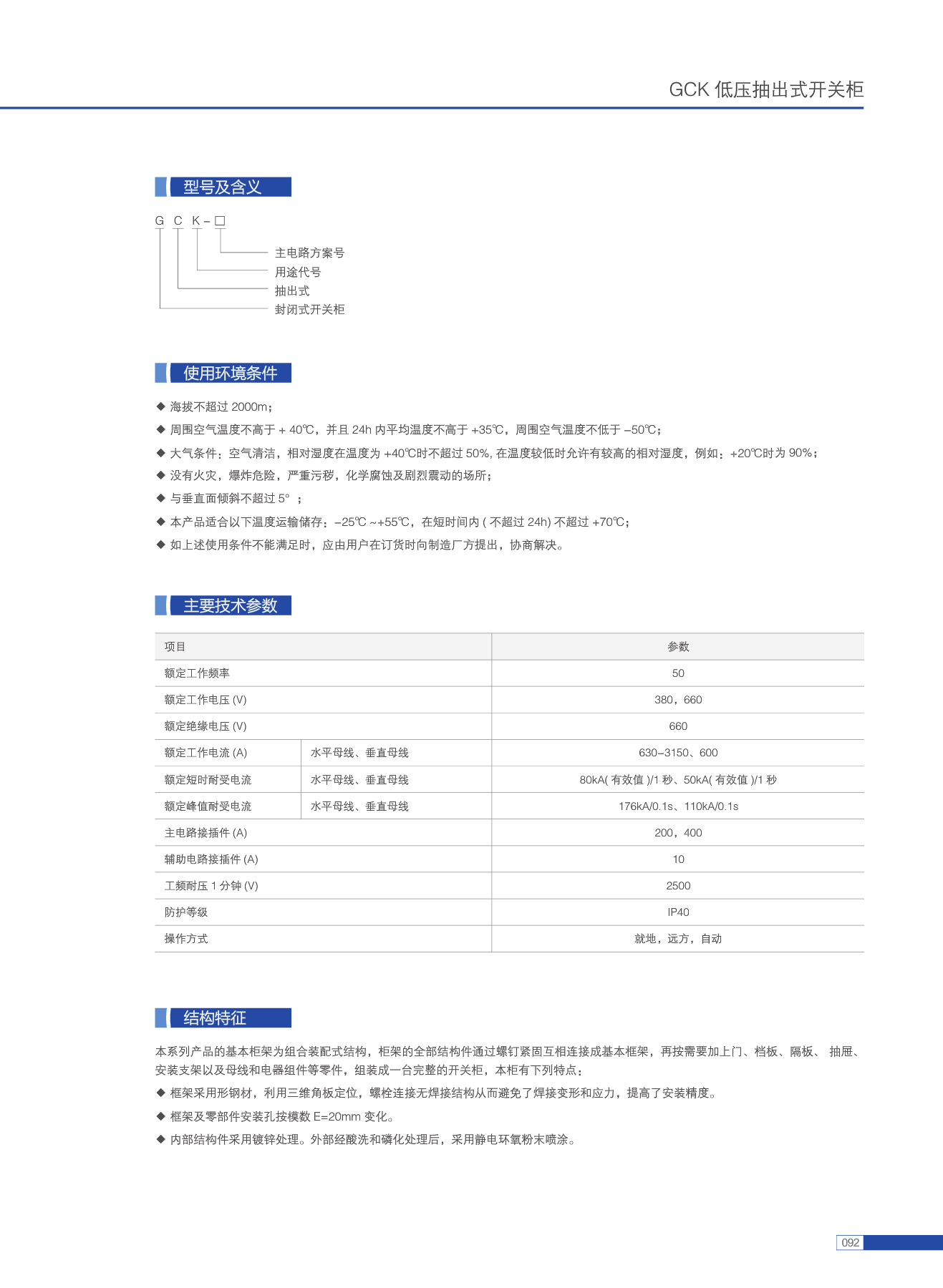 GCK低压抽出式开关柜由动力配电中心(PC)柜和电动机控制中心(MCC)二部分组成,适用于发电,变电站,工矿企业等电力用户作为交流50Hz,最大工作电压至660V,最大工作电流至3150A的配电系统中,作为动力配电,电动机控制及照明等配电设备的电能转换分配控制之用。