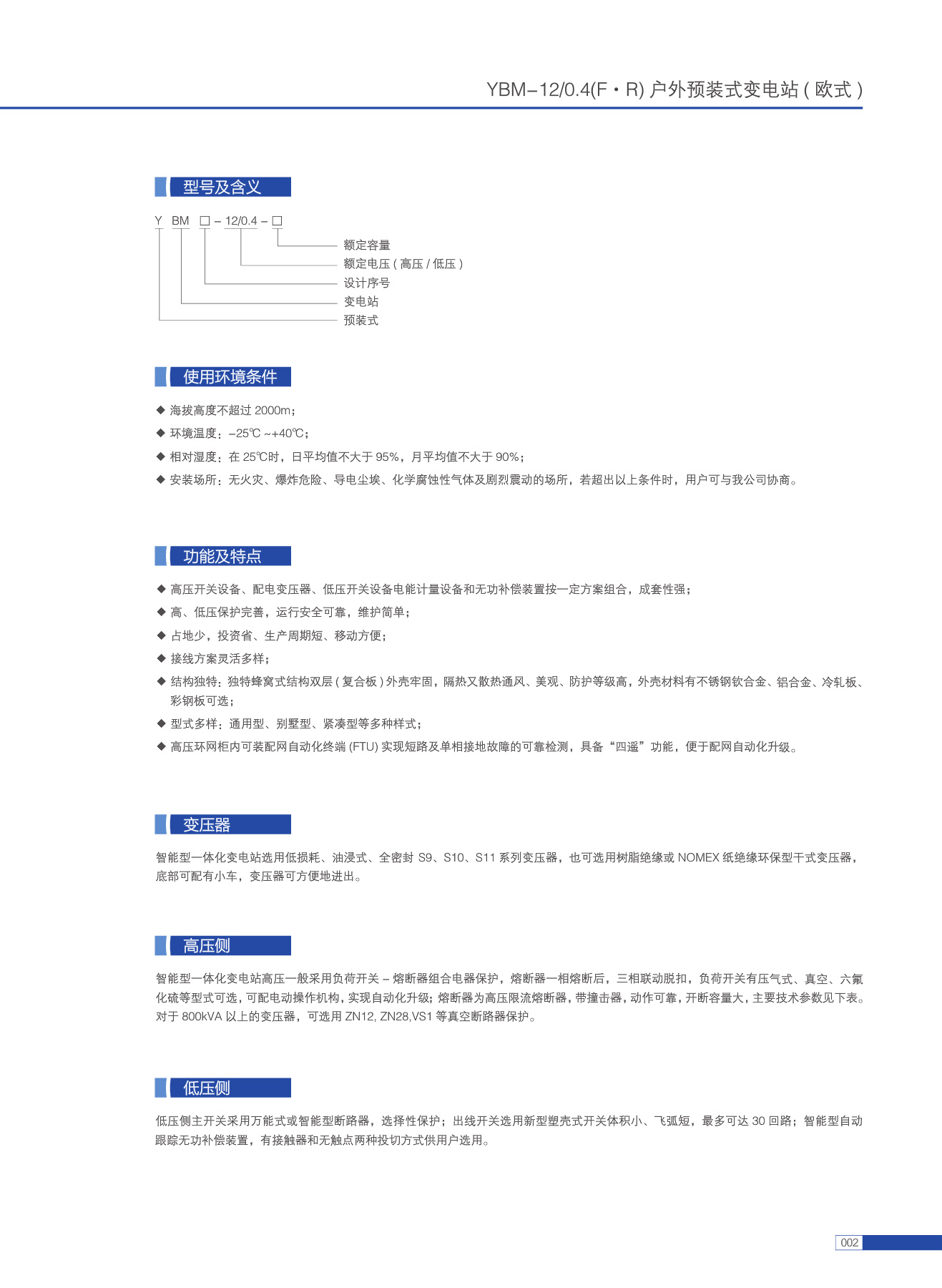 YBM-12/0.4(F●R)户外预装式变电站(欧式)广泛用于城市电网改造、住宅小区、高层建筑、工矿、宾馆、商场、机场、铁路、油田、码头、高速公路以及临时性用电设施等户内外场所。